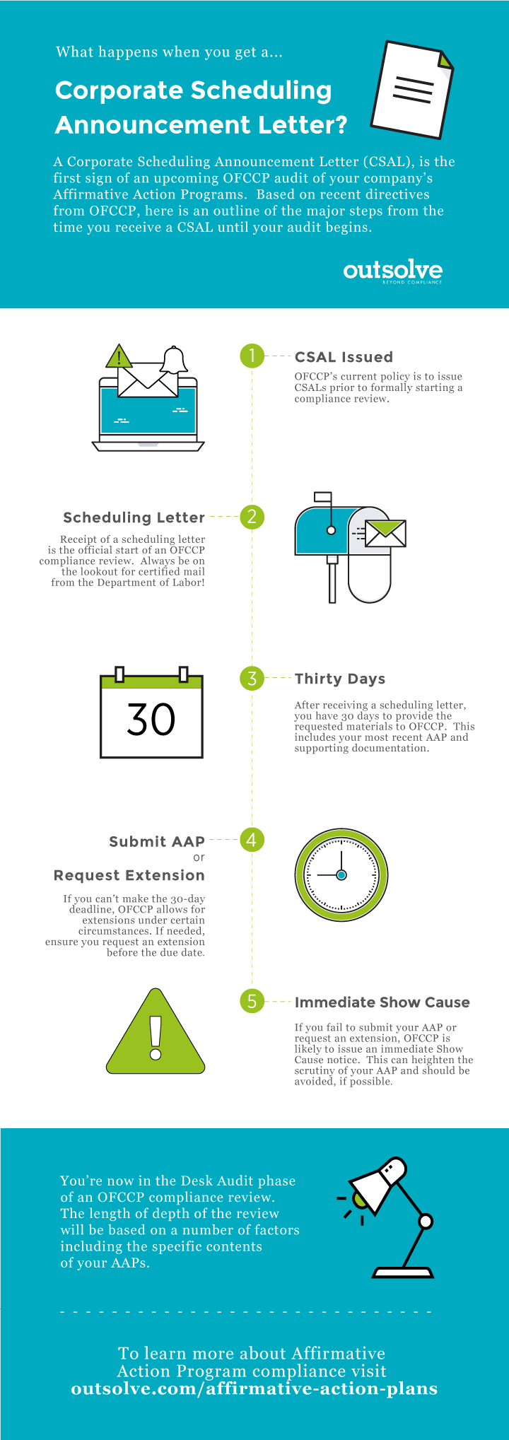 The CSAL is a courtesy notification offering resources and assistance. The Scheduling Letter initiates the compliance evaluation process. The Scheduling letter alerts a particular federal contractor establishment that is has been selected for a compliance review.